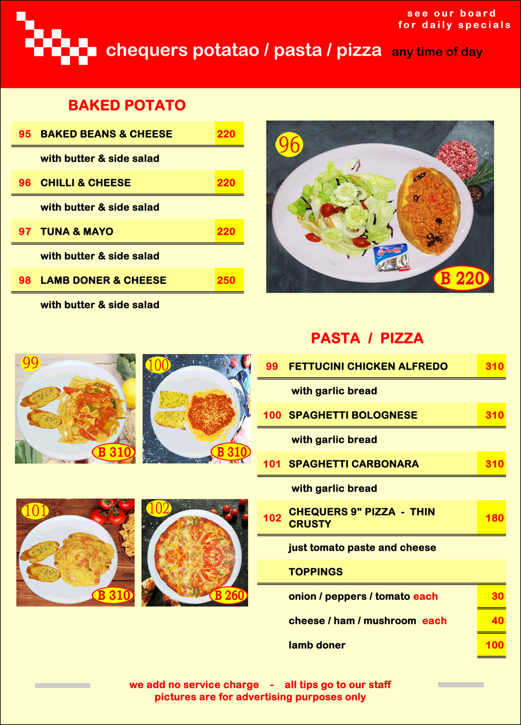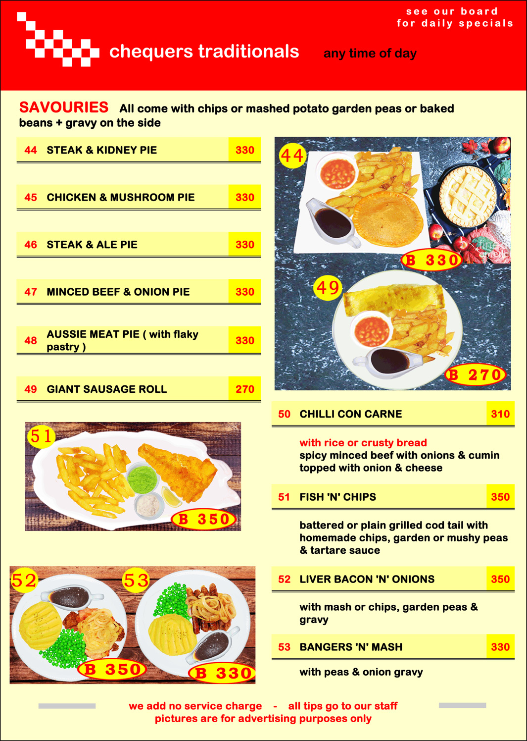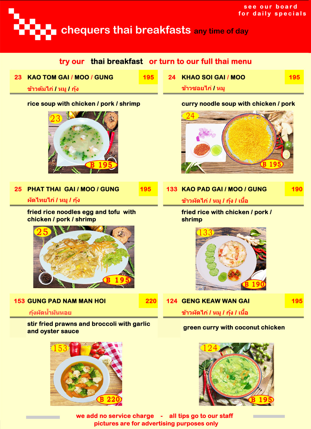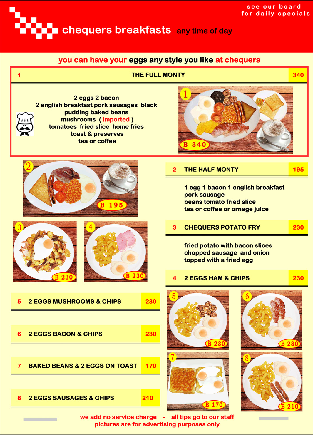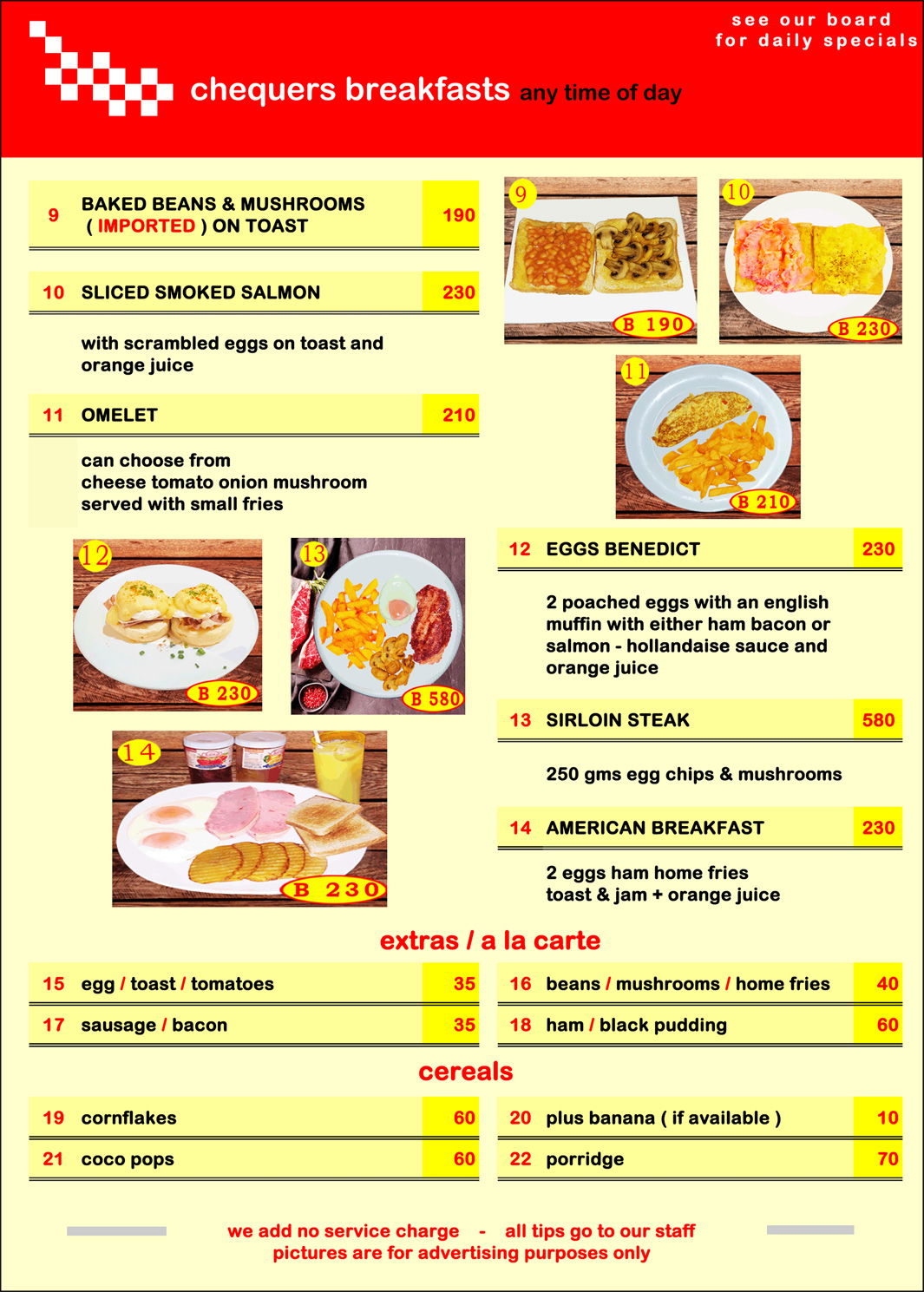 | From a full monty English Breakfast to a Sunday Roast, chequers has a very large menu, catering for all tastes. Our chefs have over 30 years of experience preparing both Western and Thai dishes. Listed Number 1 on Tripadvisor for English food in Bangkok. |
